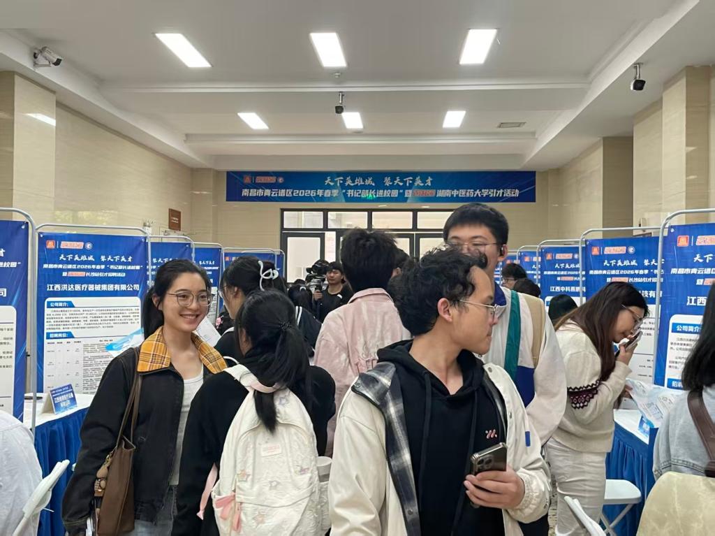 活动期间,同步在济世楼南栋一楼大厅举办了专场招聘会。来自南昌市的18家优质用人单位现场设展,涵盖生物医药、医疗卫生等重点产业领域,提供岗位数400余个。招聘会现场气氛热烈,学生积极投递简历,与企业代表深入交流。